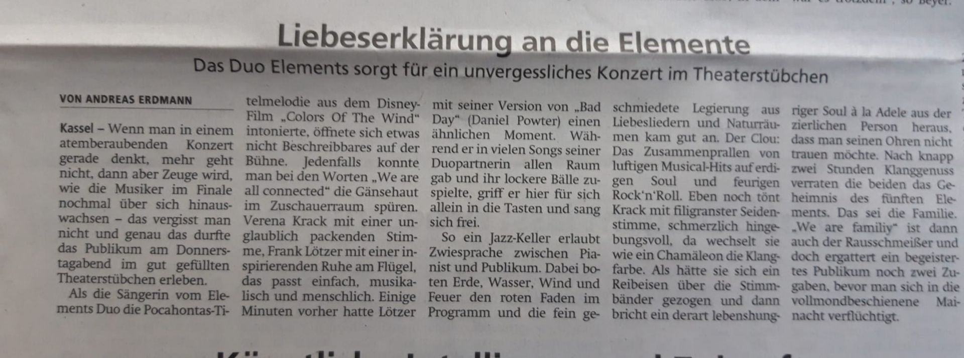 So könnte das Thema heißen, dem sich Verena Krack (vocals, flute) und Frank Lötzer (piano, vocals) in ihrem neuen Programm „Elements“ verschrieben haben.